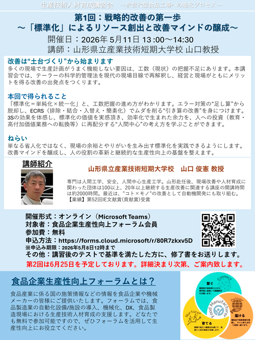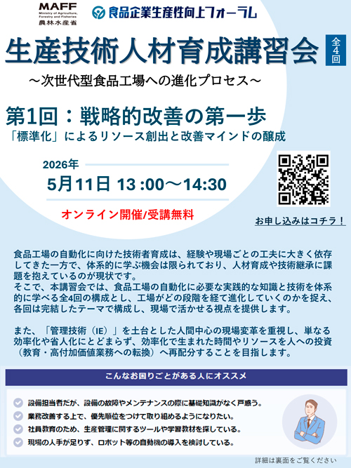 【農林水産省】「食品企業生産性向上フォーラム 生産技術人材育成講習会 ~次世代型食品工場への進化プロセス~」(オンライン講習) 2026 4/15 その他 案内チラシはこちら 詳細はこちら お申し込みはこちら その他 URLをコピーしました! URLをコピーしました! 「荷主企業四日市港利用支援事業をご利用ください」【四日市港管理組合】
